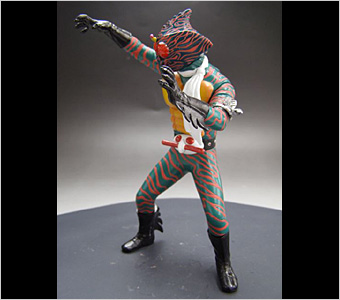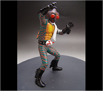 <ソフビ魂シリーズ>に7人ライダー集結!異形の戦士 アマゾンライダーここに登場!!ヘルメットはクリアパーツで目の中の複眼まで再現。ギギの腕輪、コンドラー、マフラーは別パーツ化することで精密な造形を実現した。ディスプレイに便利な特製補助スタンドが付属。